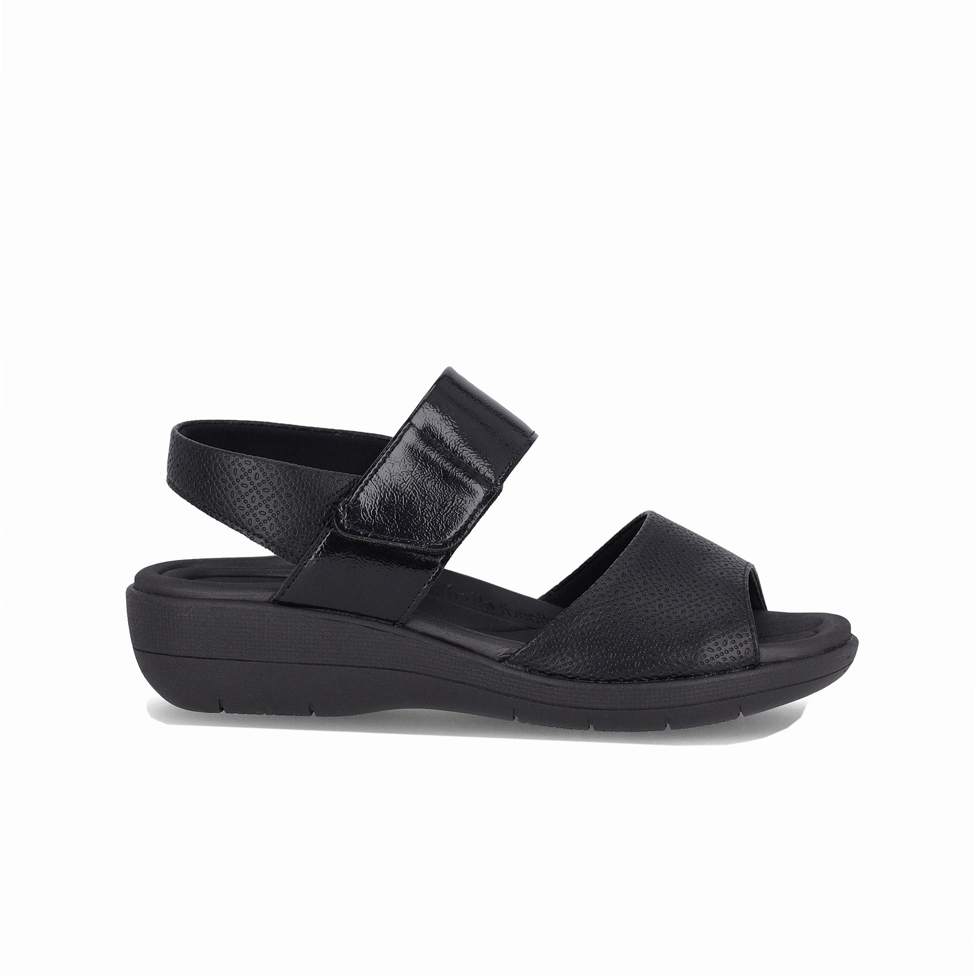 Práctica y ligera. La Sandalia Fascitis fue diseñada para acompañarte con elegancia y comodidad. Este modelo cuenta con una plantilla anatómica más ancha y ultrasuave que alivia el dolor de la fascitis plantar. La tecnología WIDE FIT mantendrá tus pies confortables y bien acomodados gracias a sus hormas con medidas especiales. Con materiales que aumentan la elasticidad, se adapta a la forma del pie, previniendo el dolor de juanetes y haciendo la zona más discreta. Además, cuenta con una plantilla anatómica, superamortiguación, un acabado supercómodo, un forro supersuave y una suela superadherente, lo que la hace indispensable para quienes trabajan de pie durante horas. Este modelo es el equilibrio perfecto entre practicidad y belleza.